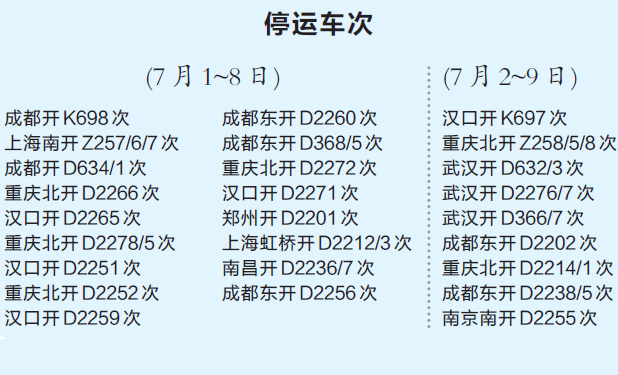 昨日,成都铁路局发布消息称,受鄂西南地区水害影响,宜万铁路需继续检修,即日起至7月9日,我市始发和经停的多趟列车运行路径将发生改变,包括重庆至武汉、上海等地多趟列车停运。已购买车票的旅客可到车站窗口办理退票或改签。成都铁路局提醒广大旅客,受暴雨影响,成都铁路局管内渝利铁路、渝怀铁路、襄渝铁路、达万铁路将面临暴雨考验。为确保安全,遇暴雨铁路部门可能会封锁铁路检查线路、设备状况,由此影响列车正常运行,请广大旅客留意车站公告和微博或致电12306询问,并随时关注天气变化情况,以便合理安排自己的行程。